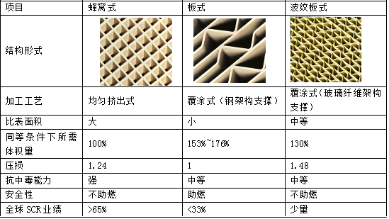 目前世界上对于催化剂可以分为三类:蜂窝式催化剂,板式催化剂,波纹板式催化剂。目前市场上主流的SCR催化剂有三种,分别为蜂窝式、板式与波纹板式,对比如下: