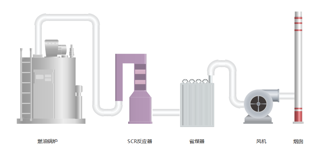为了保证SCR脱硝温度,在燃油锅炉出口省煤器进口增加一套SCR反应器,200℃温度的烟气与由喷氨装置内过来的氨水喷雾在SCR前端烟道内,经过导流板与混合格栅充分混合,进入SCR设备内部,经过催化剂表面进行反应,将NOX去除,经过脱硝后的烟气进入省煤器将温度进一步回收,降温后的烟气通过烟囱达标排放。