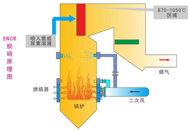 选择性非催化还原技术(Selective Non-Catalytic Reduction,简称SNCR),是一种不用催化剂,直接在850℃-1100℃的温度范围内,将含氮基的还原剂(如氨水、尿素溶液等)喷入炉内,选择性的将烟气中的NOx还原脱除,生成氮气和水的清洁脱硝技术。