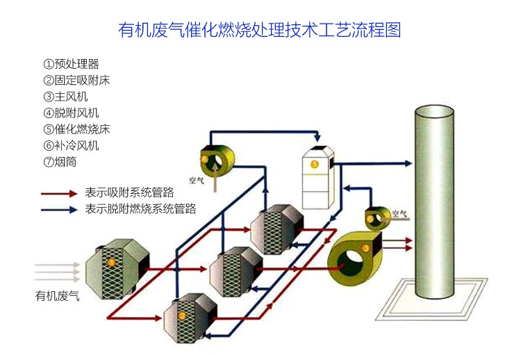 废气经过前过滤装置,去除颗粒物杂质和湿度后,进入活性炭吸附床,经蜂窝活性炭浓缩之后,再利用小风量热气脱附;脱附下来的高浓度废气送入后端的催化燃烧炉,在催化剂的作用下实现无焰反应,生成无害的CO₂和H2O,经风机引出,通过烟囱高空达标排放。
